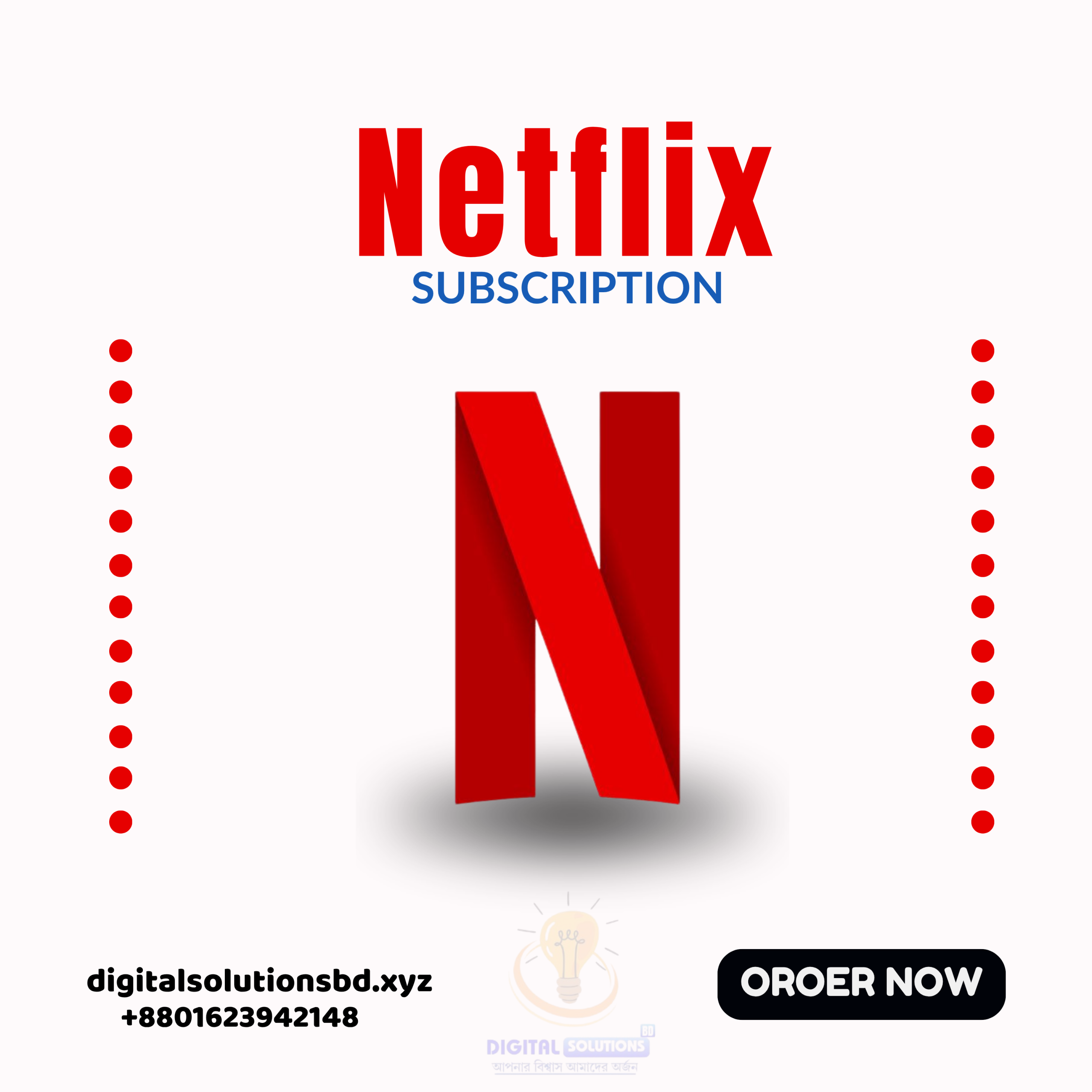 Digital Solutions BD থেকে সাশ্রয়ী মূল্যে Netflix সাবস্ক্রিপশন নিয়ে উপভোগ করুন প্রিমিয়াম বিনোদনের নতুন অভিজ্ঞতা। আমাদের মাধ্যমে আপনি সহজেই পেতে পারেন অসংখ্য মুভি, টিভি সিরিজ এবং এক্সক্লুসিভ কনটেন্ট—যা আপনি যেকোনো সময়, যেকোনো জায়গা থেকে দেখতে পারবেন। অ্যাকশন, ড্রামা, কমেডি কিংবা ডকুমেন্টারি—সব ধরনের কনটেন্টই এখানে রয়েছে।